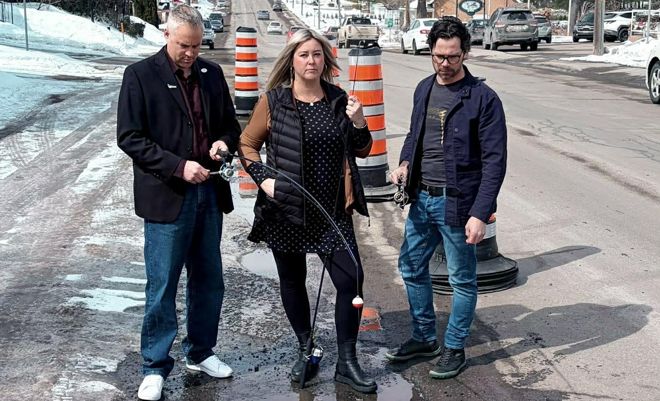 Même s’ils simulent une partie de pêche, Charles-André Pagé, Émilie Boisvert et Simon Beaudry insistent sur le fait que ce n’est pas un poisson d’avril. (Photo gracieuseté)